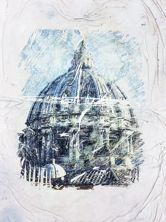 Many of the images I captured while in Italy incorporated modern people and structures, surrounded by ancient ruins and artifacts. After returning to Alaska, I decided to make these new images of modern day Italy, old again, by turning them into inspired frescos. I tried to achieve this by making plaster plates, then I used the xylene image transfer process to manipulate the surface of the plaster and mimic the look of an aged fresco.